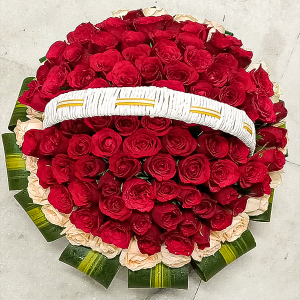 Delight in the beauty of nature with our Elegant Rose Harmony Basket, a beautiful arrangement featuring a stunning blend of red and soft peach roses, artistically crafted into a dome-shaped bouquet. Accented with lush green decorative leaves and set in a charming basket, this floral masterpiece radiates elegance and love. Perfect for anniversaries, romantic gestures, or special celebrations, this bouquet speaks the language of affection and timeless charm.