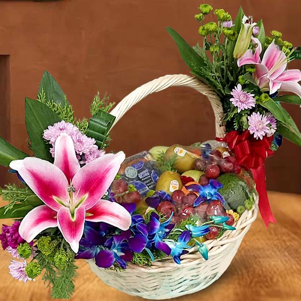 This beautifully arranged basket features a charming blend of fresh, fragrant flowers paired with a handpicked selection of seasonal, juicy fruits. Perfectly balanced in color, aroma, and flavor, it’s a delightful gift that speaks of love, care, and celebration.